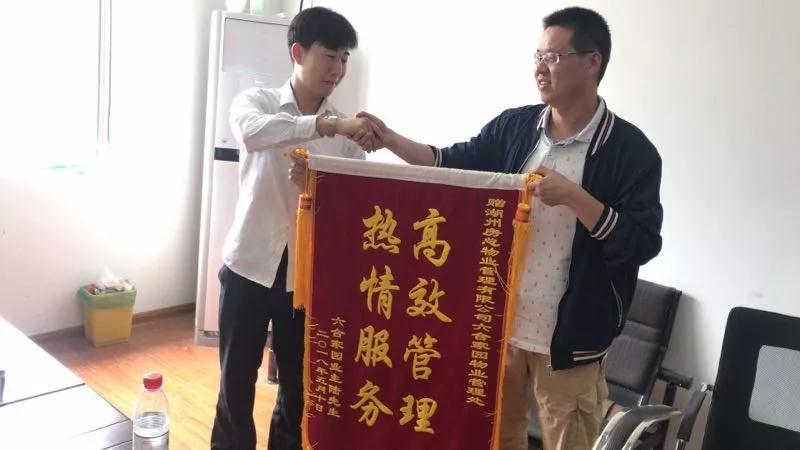 “你們的工作真不錯(cuò)”,5月11日上午,六合家園業(yè)主陸先生拿著印有“高效管理 熱情服務(wù)”的錦旗來(lái)到物業(yè)辦公室,對(duì)工作人員表示感謝,對(duì)物業(yè)工作表示肯定。