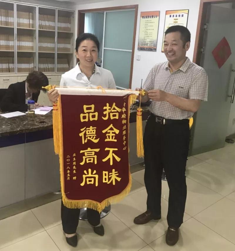 管理處工作人員立馬通過(guò)業(yè)主微信群,借助網(wǎng)絡(luò)力量當(dāng)天就找到了失主,原來(lái)是新華府業(yè)主周先生。為感謝胡金寶同志的拾金不昧,周先生想以現(xiàn)金的方式表示感謝,于是就發(fā)生了開(kāi)頭的這一幕,看到胡金寶同志的堅(jiān)持,翌日,周先生拿著一面“拾金不昧 品德高尚”的錦旗送到新華府物業(yè)管理處。