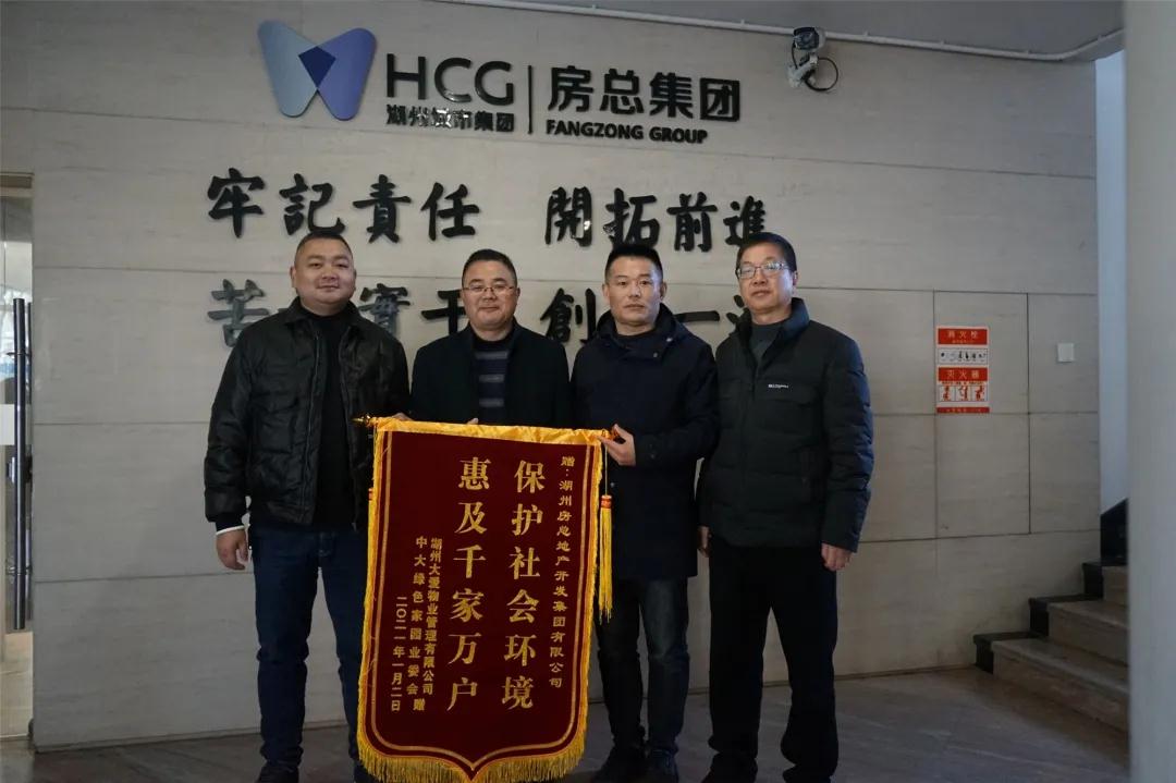 2021年1月13日上午,仁皇山街道二社區(qū)書記郭棟與凱萊國際及中大綠色家園小區(qū)業(yè)委會、物業(yè)公司相關(guān)人員將一面寫有“保護社會環(huán)境 惠及千家萬戶”的錦旗送到房總集團,為公司對該區(qū)域小區(qū)實施“污水零直排”建設(shè)這一民生實事表示感謝。