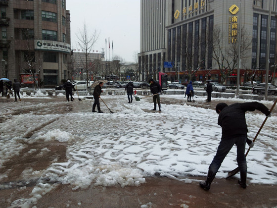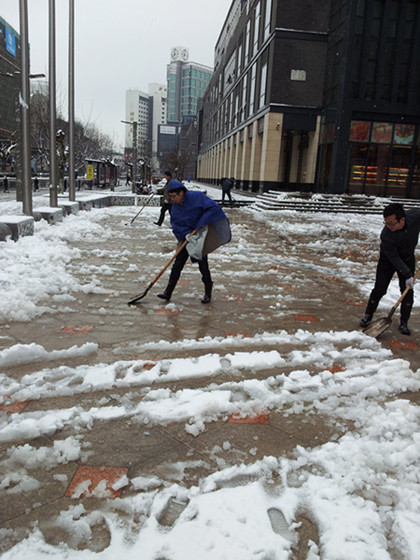 年前下了兩場(chǎng)大雪,愛山廣場(chǎng)路面積雪給通行帶來了極大的不便,也影響了周邊店鋪正常營業(yè)。公司團(tuán)委兩次組織青年團(tuán)員掃雪鏟冰。大家冒著風(fēng)雪,不顧嚴(yán)寒迅速開動(dòng),趕在路面凍結(jié)以前將積雪清除,現(xiàn)場(chǎng)呈現(xiàn)出一派熱火朝天的景象。在幾個(gè)小時(shí)的共同努力下,愛山廣場(chǎng)的一些主要路面得到了清掃,保障了車輛順利通行,方便了行人安全出行,同時(shí)也為商業(yè)街區(qū)的正常營業(yè)提供了良好的環(huán)境。